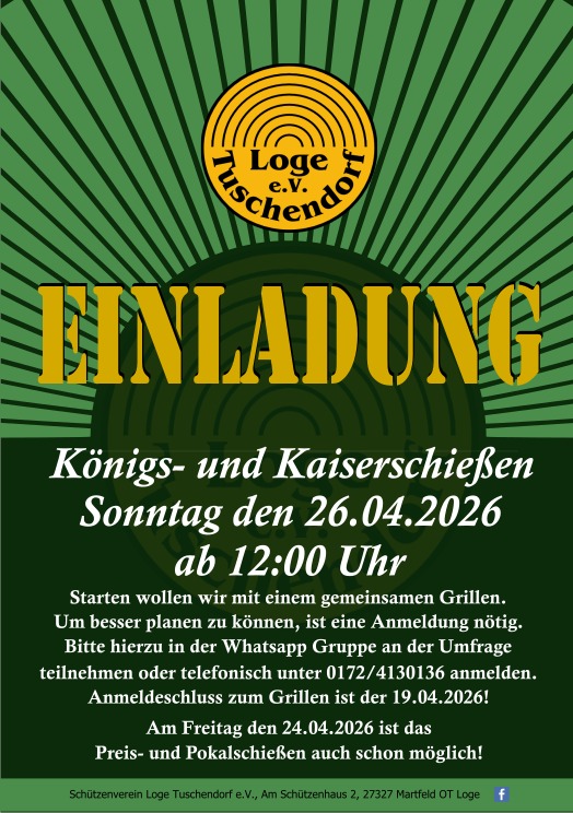 Am 26.04 findet wieder unser traditionelles Königsschießen statt. Um 12:00 wird mit dem Grillen begonnen, danach erfolgt ab 13:00 das Königsschießen.